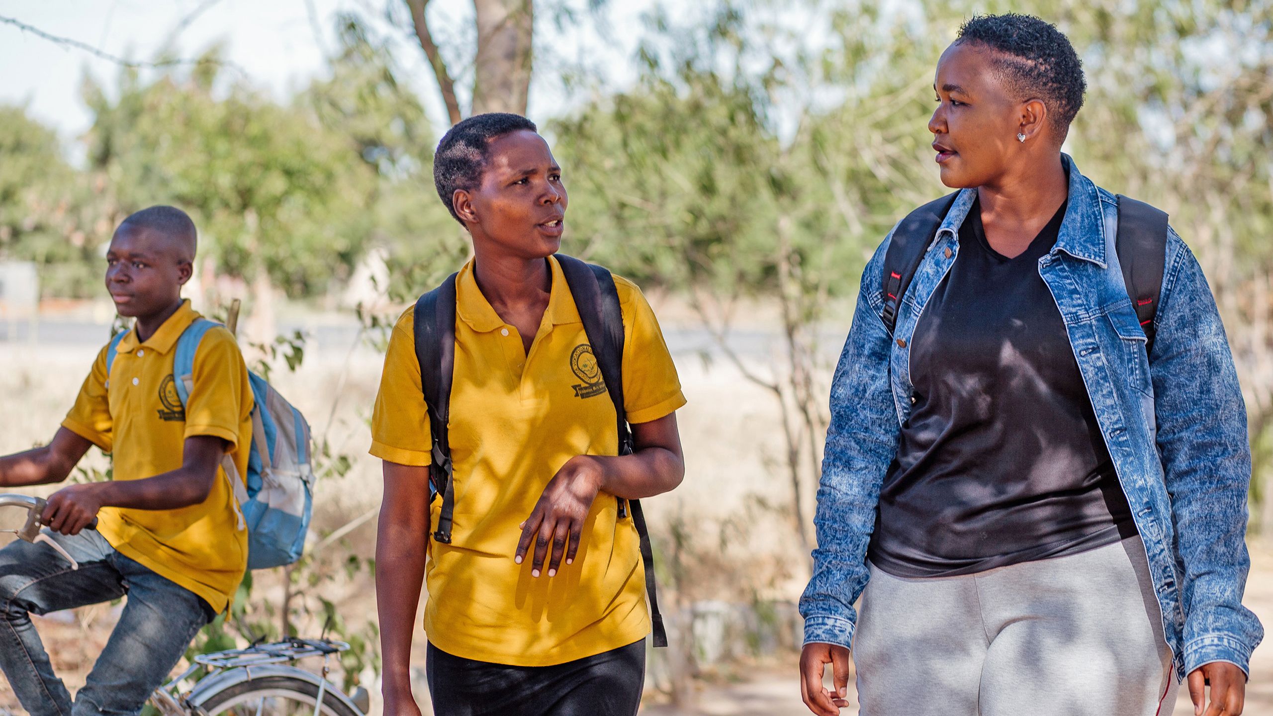 Tecla (rechts) und Teresia (Mitte) machen sich gemeinsam auf den Weg zum Ausbildungszentrum in Dodoma, Tansania. Beide Frauen haben ihren Partner bei einem Unfall verloren und wollen mit der Maurerinnen-Ausbildung von Helvetas ihr Leben selbst in die Hand nehmen. Mit der Aussicht auf ein regelmässiges Einkommen wünscht sich Teresia momentan, dass sie ihrer Mutter das Ziehen eines schmerzenden Zahns ermöglichen kann, Tecla will genug Geld zusammenkriegen für den Schulunterricht ihrer Tochter. Schritt für Schritt bauen die Frauen sich und ihren Familien eine bessere Zukunft auf.