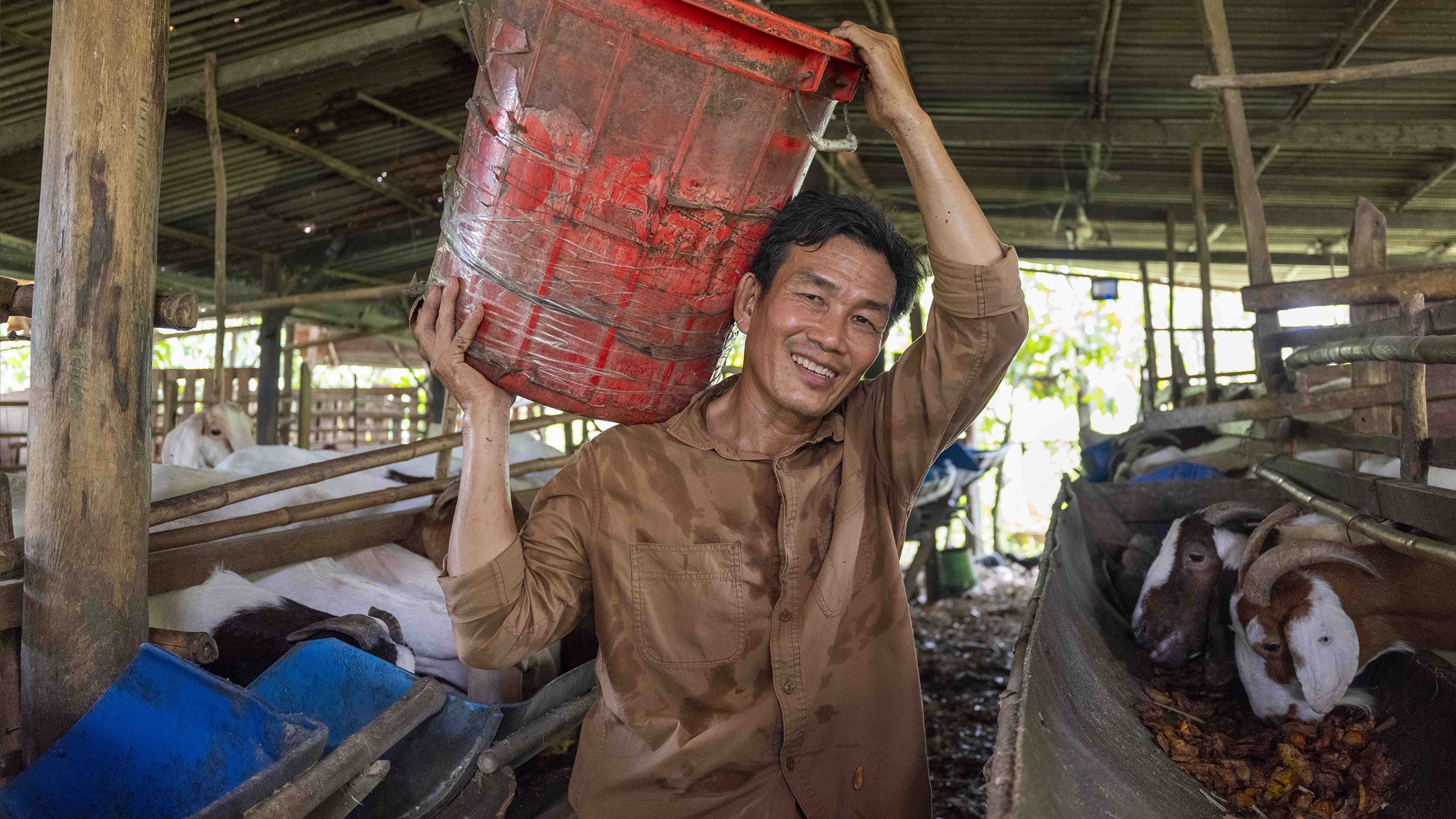 Hoang Nguyen Van aus Vietnam bewirtschaftet seine Kakaofarm im Kreislauf: Fruchtschalen und Blätter dienen als Futter für die Ziegen, deren Mist mit Pflanzenresten kompostiert wird und die Kakaobäume nährt. Mit Unterstützung von Helvetas gibt er sein Wissen als Trainer an andere Bauern weiter und erhielt einen Ofen, in dem er aus Resten biologische Kohle erzeugt. Diese kann für die Herstellung von Bio-Plastik genutzt werden; andere Pflanzenabfälle werden zu Papier verarbeitet, das die Schokolade aus seinem Kakao verpackt. Für Hoang zählt: Nichts soll ungenutzt bleiben.